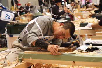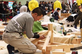 今回は全30 職種に全国から514 名の選手が参加し、建築大工職種には厚生労働省認定資格 一級建築大工技能士資格者で一定の実務経験を積んだ熟練技能者43 名が参加して「正六角形小屋組」を製作する課題で熟練の技を競いました。