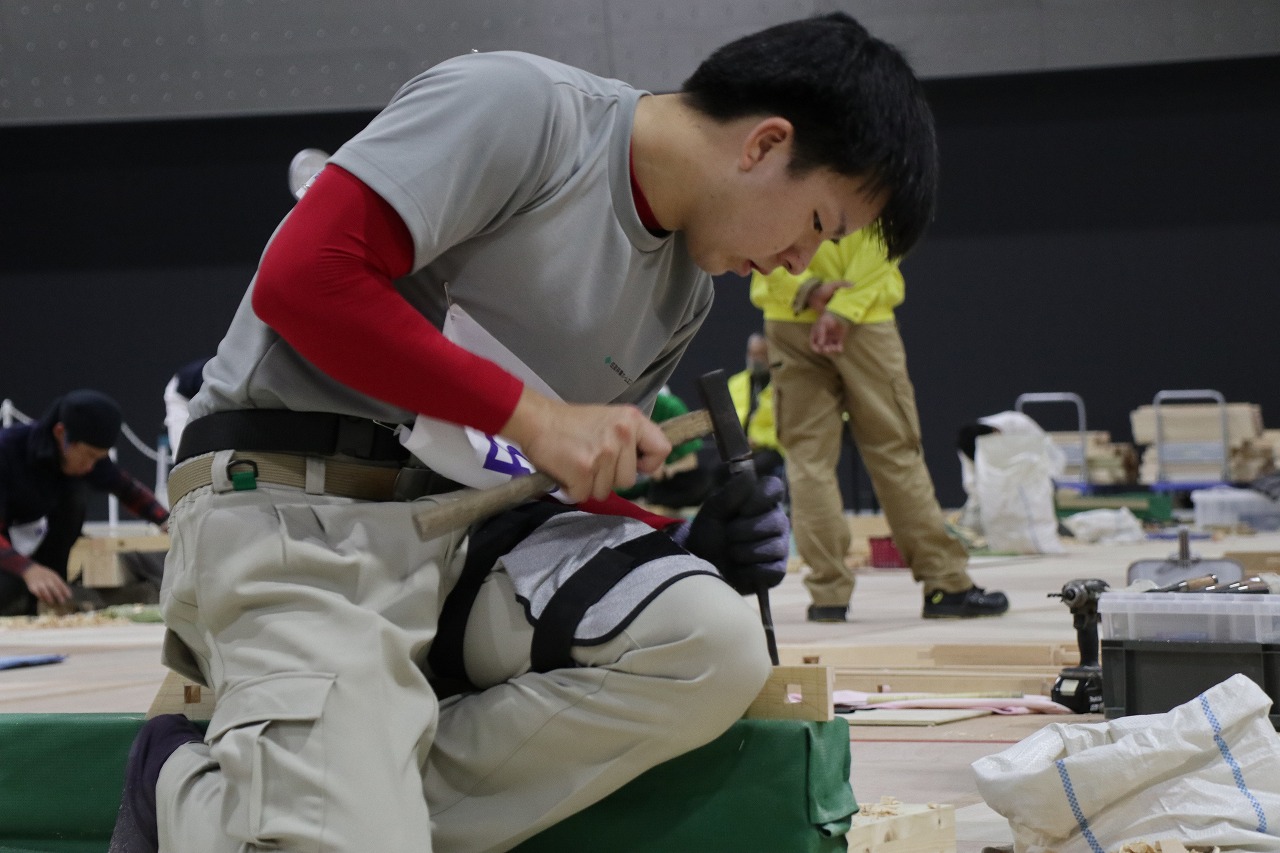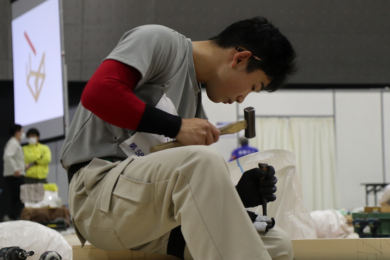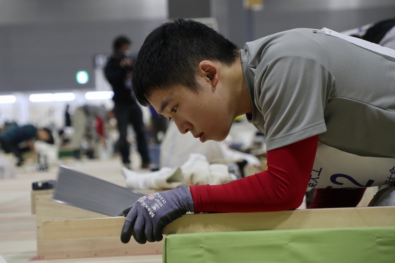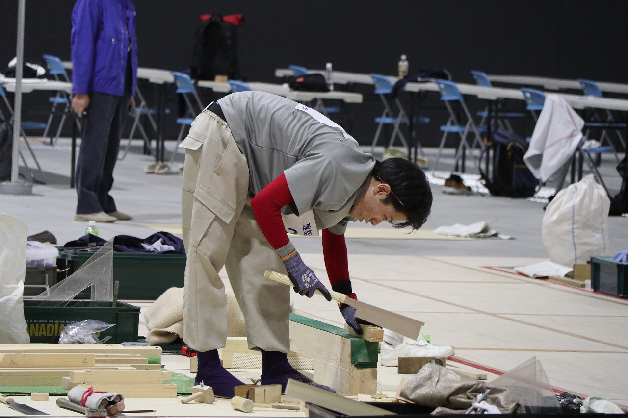 本年は11月13日(金)から11月16日(月)の4日間にわたって愛知県国際展示場にて開催され、42職種、約950名の満23歳以下の技能者が都道府県を代表して競技が行われ、建築大工職種部門では53名の選手が参加されました。今年は新型コロナ感染症拡大の影響を受け、競技は無観客での実施となりましたが、無事に開催され、数カ月の特訓の成果を発揮できたことは大会関係者の皆さまに深く感謝いたします。